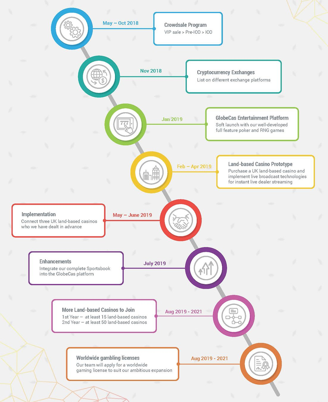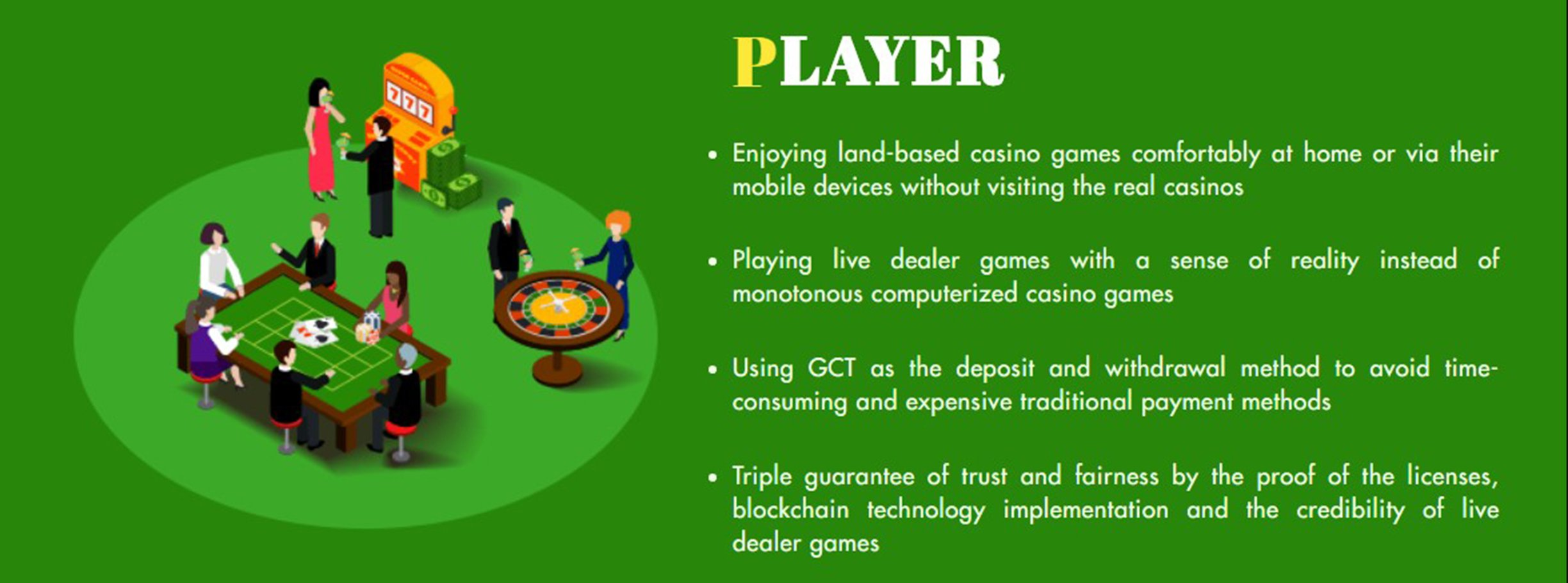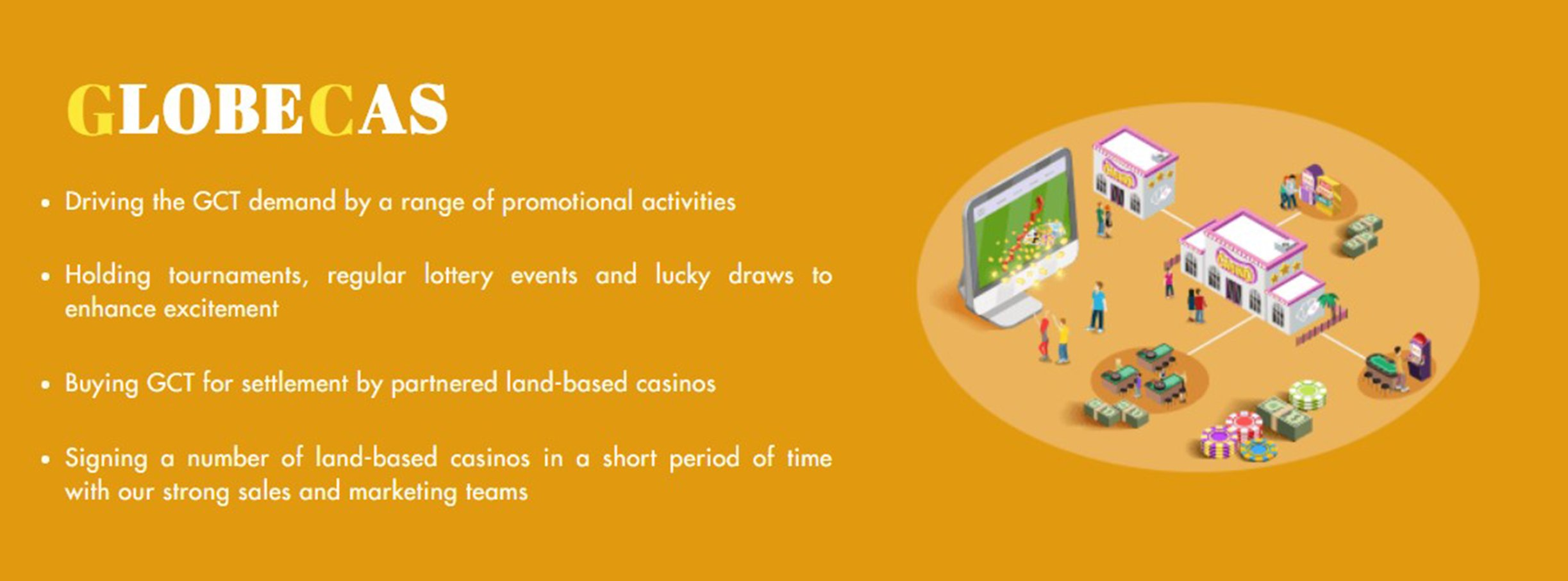 GlobeCas memberikan solusi sempurna untuk menyederhanakan proses kasino berbasis lahan sehingga pindah ke format online sambil meminimalkan biaya. Bersama dengan Token GlobeCas (GCT) kami, token utilitas yang akan menyelesaikan sebagian besar masalah transaksi, pemain dapat menikmati game di seluruh dunia.