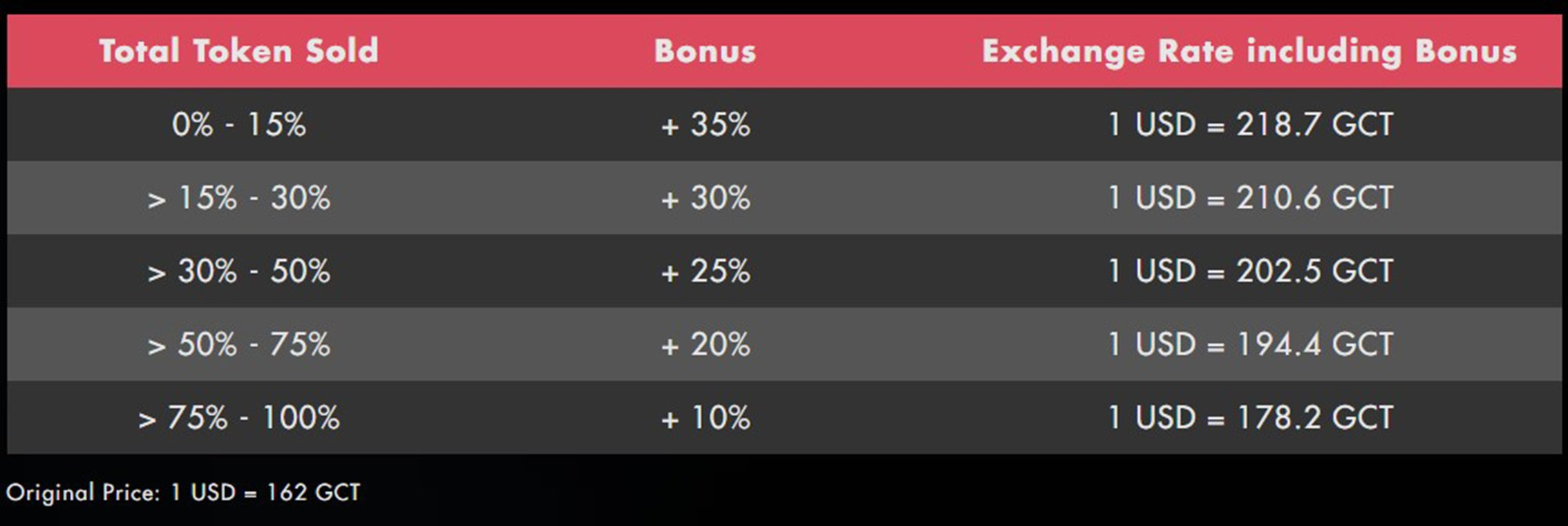 PreICO Harga: 1 USD = 218,7 GCT