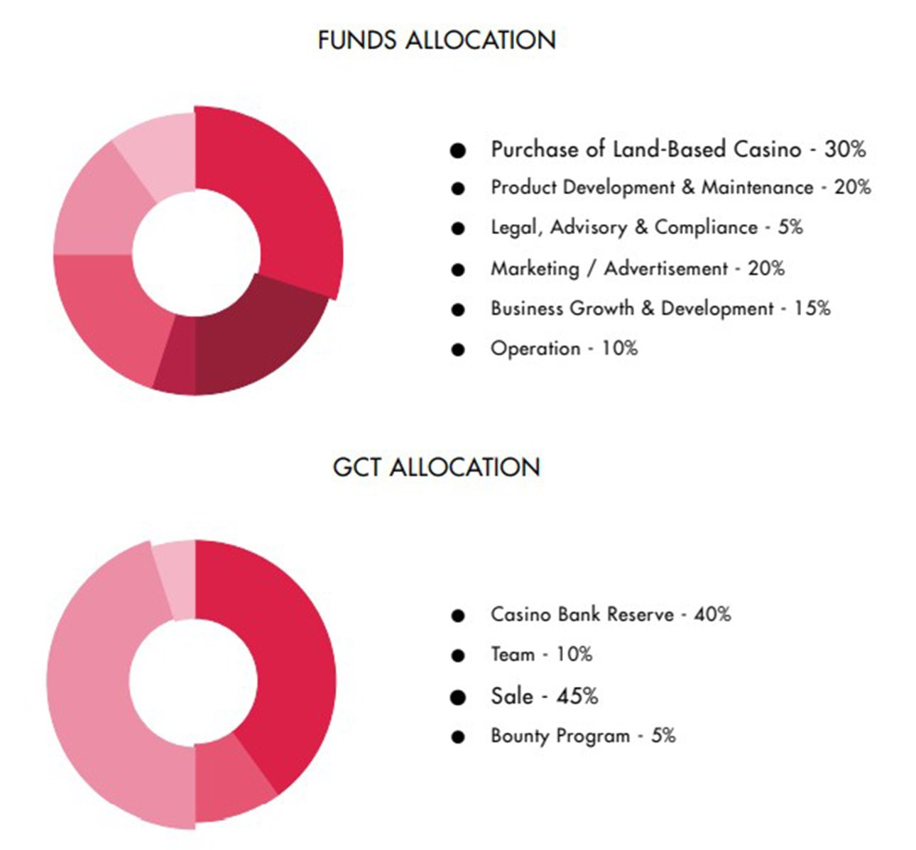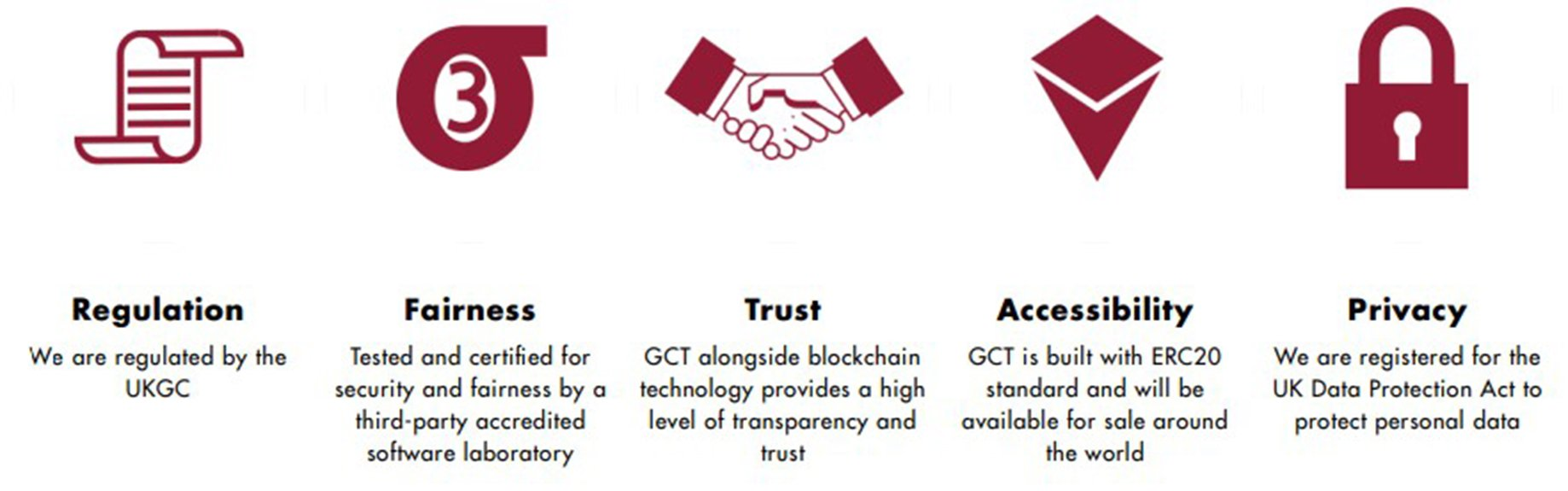 Menurut undang-undang perjudian Inggris dengan ketentuan lisensi LCCP 4.1.1 dan 4.2.1 berkaitan dengan perlindungan pendanaan klien, bahkan klien yang telah menyetor uang ke perusahaan, masih memiliki token sampai mereka digunakan dalam perjudian. Oleh karena itu, penting untuk memisahkan operasi bisnis dari token pelanggan. Metode umumnya adalah menggunakan satu dompet untuk operasi dan dompet lain yang hanya bertanggung jawab untuk semua setoran dan penarikan. Dompet yang memegang token klien disebut akun terpisah. Keamanan adalah prioritas utama dalam arsitektur perangkat lunak kami. Jadi, kami meminimalkan risiko apa pun. GCT dioperasikan sebagai dua jenis berikut: