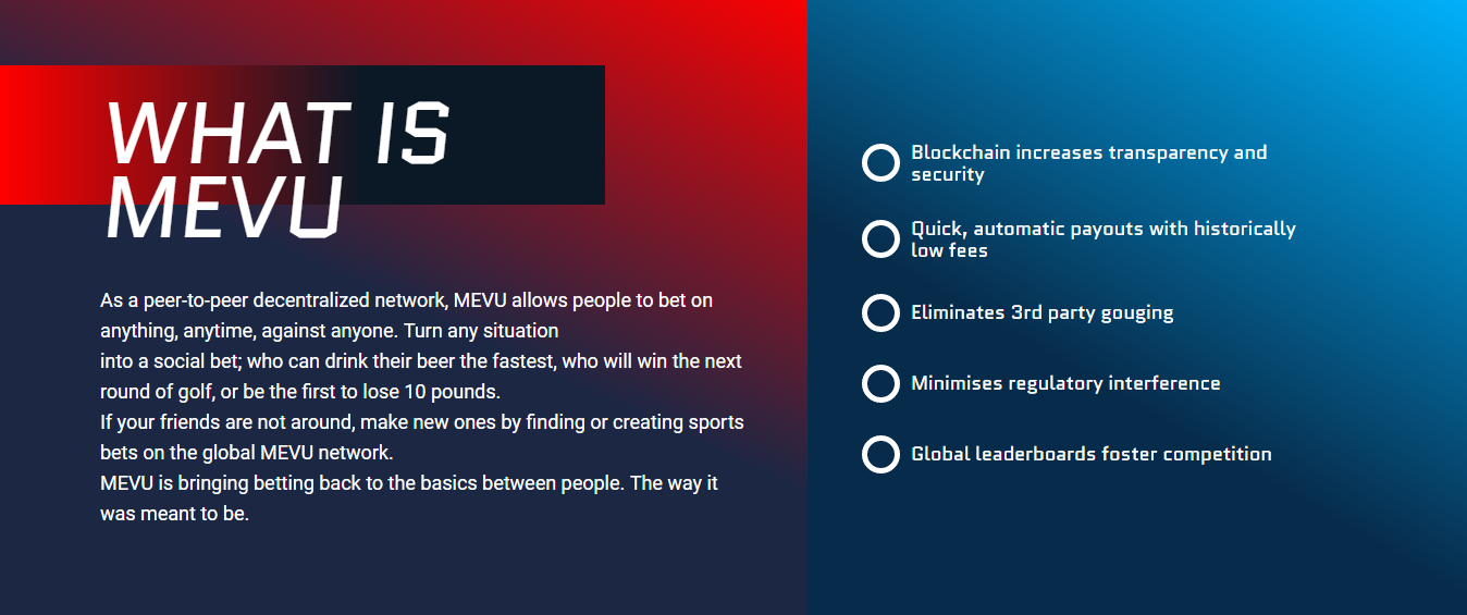 THE TYPES OF BETS AND COST STRUCTURES that aim to become the most respected global platform that is made to be true for anything, anytime against anyone. We dream of a time when common phrases can be "Let's be sure!" MeVu will initially focus on custom / social and sports head-to-head batches, but it will quickly develop to add double batches where some players can take positions against bigger single batches. You will add exclusive features to our token holders to participate in batches collected on sports games and casino style games which are possible where they use MVU tokens to play. Finally our API has been in development which allows existing betting / sites to be used for contract. Your brand is focused on bringing batches back to their basics, among people, as they should.